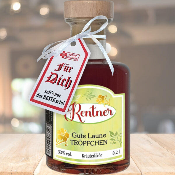 Apothekerflasche – Rentner, Gute Laune Tröpfchen – 0,2L 33% Kräuter Likör Holzkorken | Schnaps Likör Geschenk zum Ruhestand