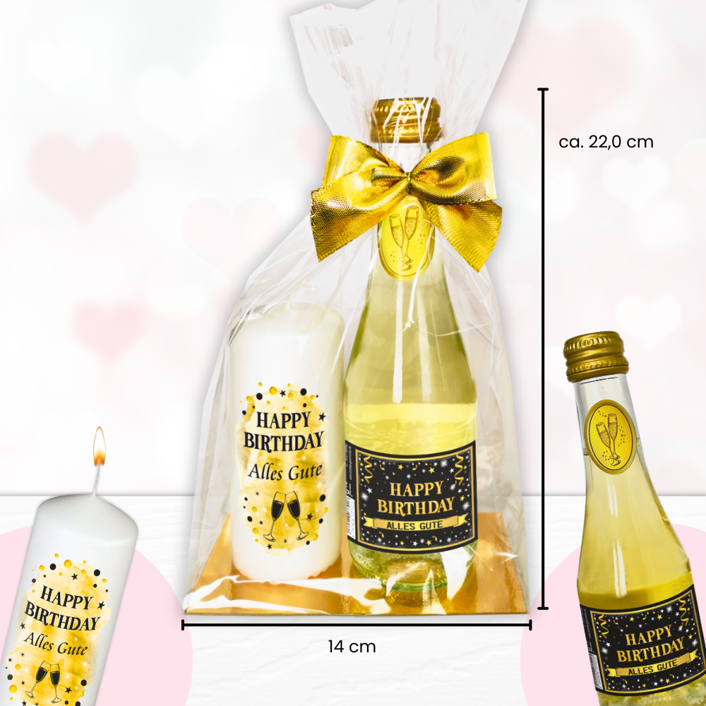 Die Geschenkverpackung ist ebenso stilvoll wie der Inhalt. Die Stumpenkerze und der Piccolo Sekt sind in einer edlen Folientüte auf goldfarbener Pappe verpackt und mit einer goldenen Schleife verziert. Die Verpackungsgröße beträgt 14,0 x 22,0 x 8,5 cm, was das Geschenkset zu einer beeindruckenden Präsentation macht.