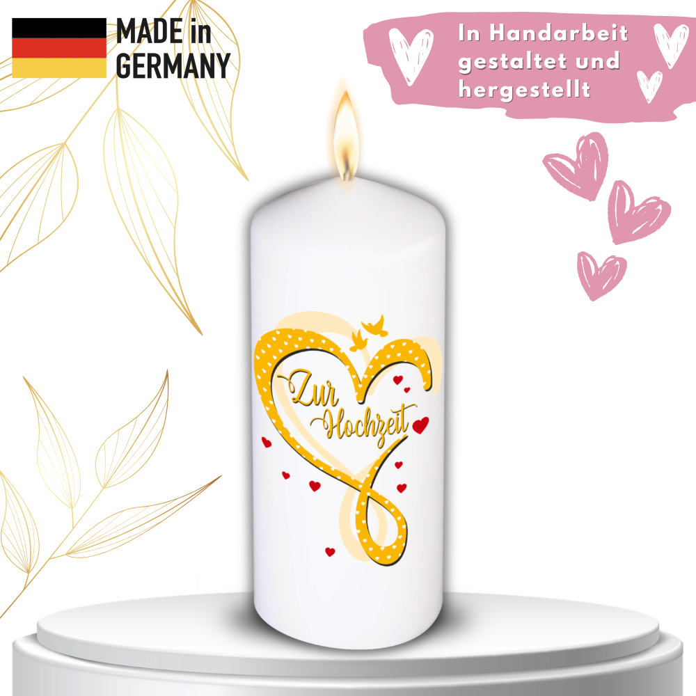- MODERNES DESIGN: Die Traukerze besticht durch ein edles goldenes Herz mit Brautpaar-Silhouette und dem roten Schriftzug „Zur Hochzeit“. Ein moderner Blickfang für jeden Hochzeitstisch.