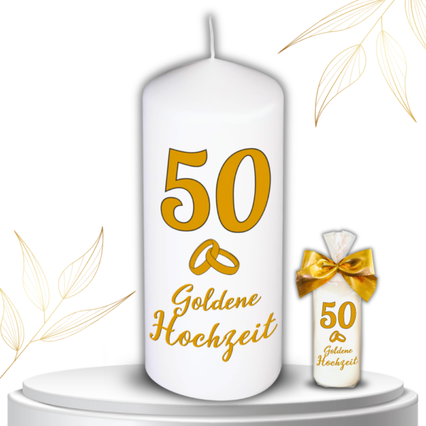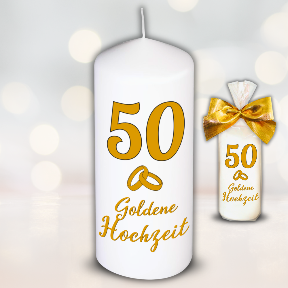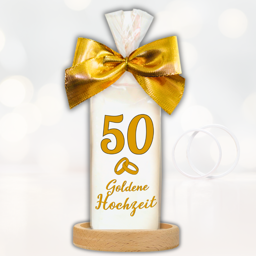 - KOMPLETTES GESCHENKSET – Erhalten Sie ein fertiges Goldene Hochzeit Geschenk ohne Aufwand. Die Kerze kommt bereits liebevoll in Geschenkfolie mit einer glänzenden goldenen Schleife verpackt sicher bei Ihnen an.