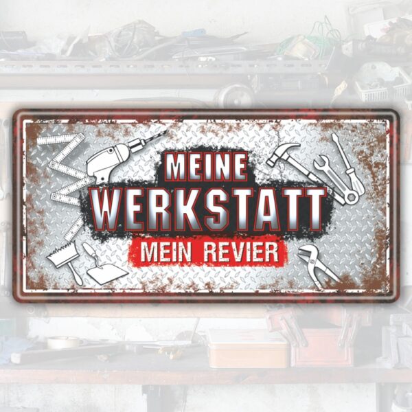 Metallschild: Meine Werkstatt – Mein Revier! Metallschilder damals und heute: Ursprünglich waren Blechschilder einst als Werbemittel in Cafes oder Bars gedacht, um Kunden auf ein besonderes Produkt aufmerksam zu machen. Doch heute schmücken die alten Reklameschilder Wohnräume, Küchen, Werkstätten, Hobbyräume, Gartenlauben und Garagen. Die begehrten Wandschilder im Vintage Syle verbinden die gute alte Zeit der Rockabilly der 60er und 70er, mit Ihrer ganz persönlichen Note und die Gegenwart mit vielen unterschiedlichen Formen und Farben. So machen Sie jeden Raum wohnlicher und interessanter.